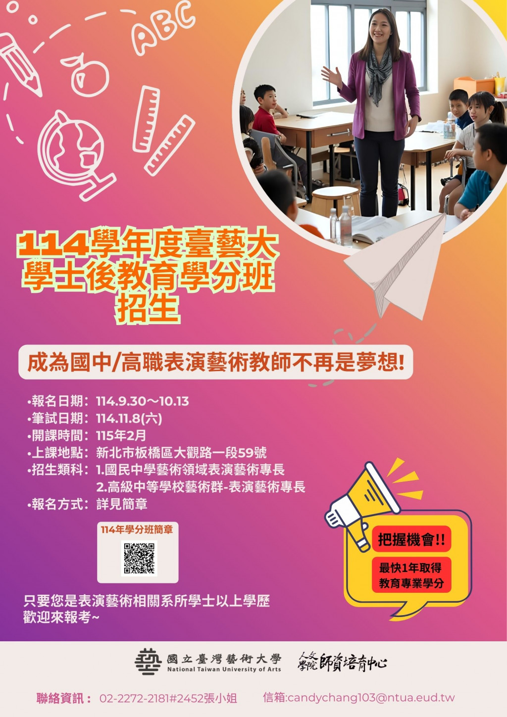 二、檢送「114學年度臺藝大學士後教育學分班招生」簡章及海報各1份,請貴校協助公告轉知。
