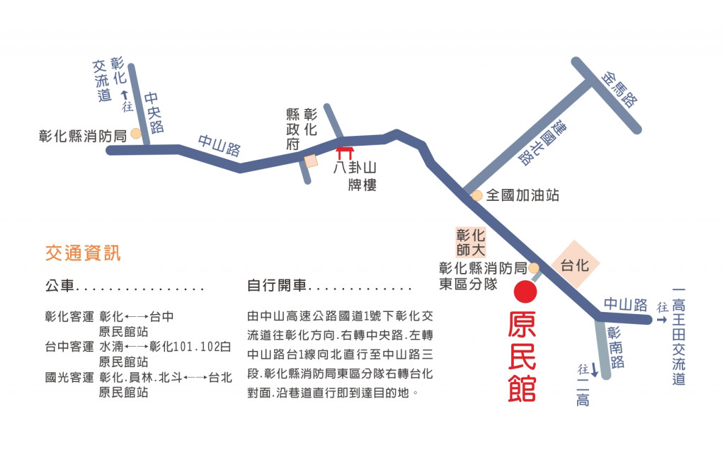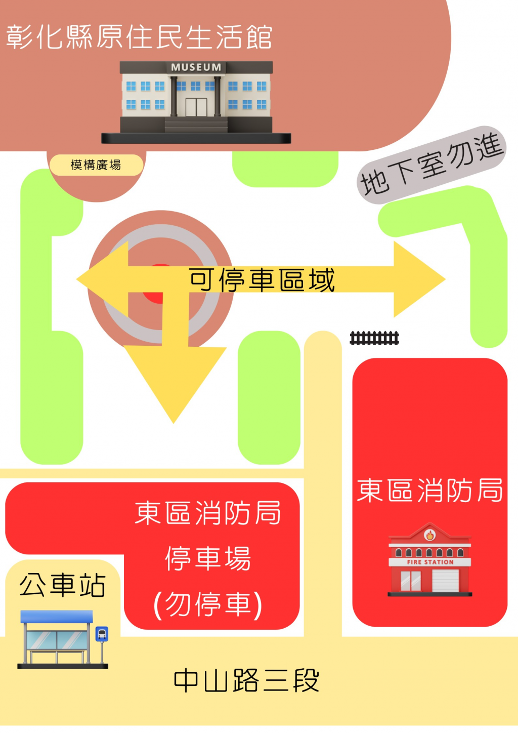 1、研習當日承辦學校校內及原住民生活館(彰化市中山路三段266之1號)戶外開放停車,惟停車位有限請盡量共乘;另請留意於原住民生活館周遭停車時請勿擋到兩側消防局出動路線。