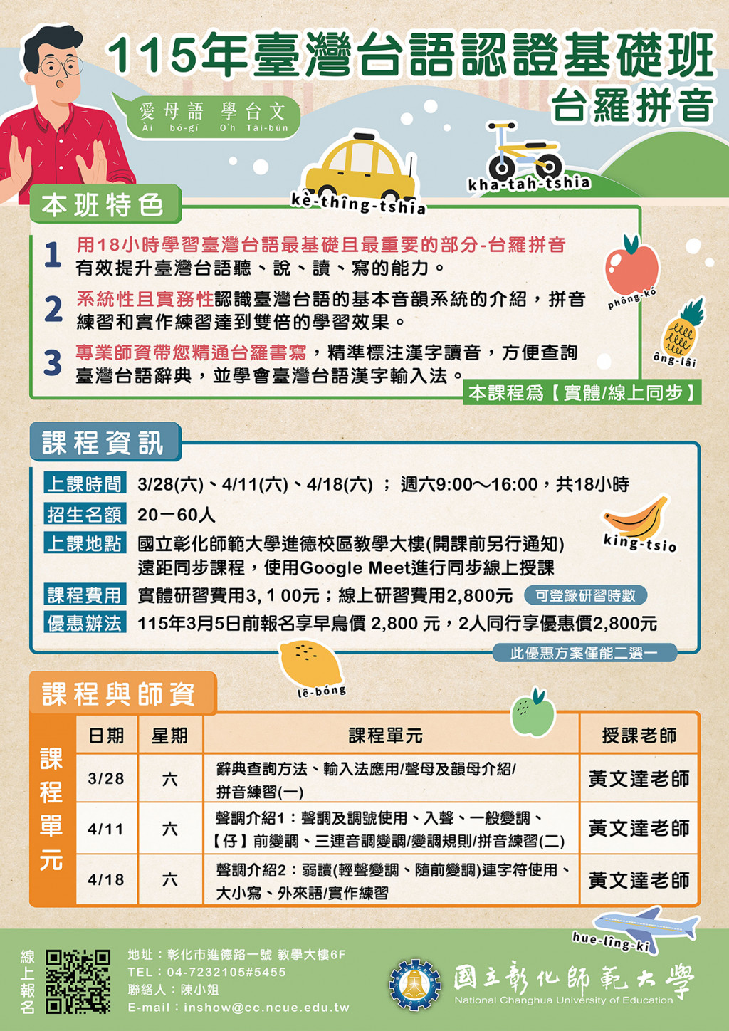 【國立彰化師範大學】檢送本校進修學院推廣教育課程「115年臺灣台語認證基礎班-台羅拼音」、「115年臺灣台語能力認證考試輔導班」課程簡章,敬請惠予公告。