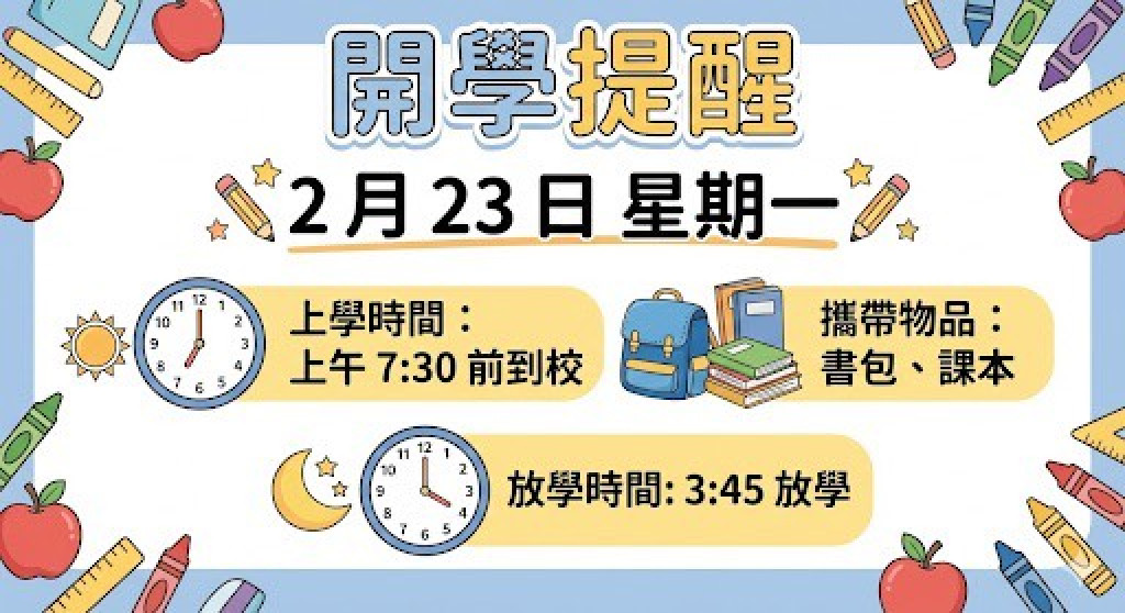 開學囉!! 請各位同學趕緊準備好您的制服、書包、課本,依照課表,2/23(一)7:30前準時入校囉! 👉提醒各位同學,2/23即為正式上課,請依照放假前三天所發放的課表準備課本。 🤩各位同學打起精神,我們星期一學校見囉!