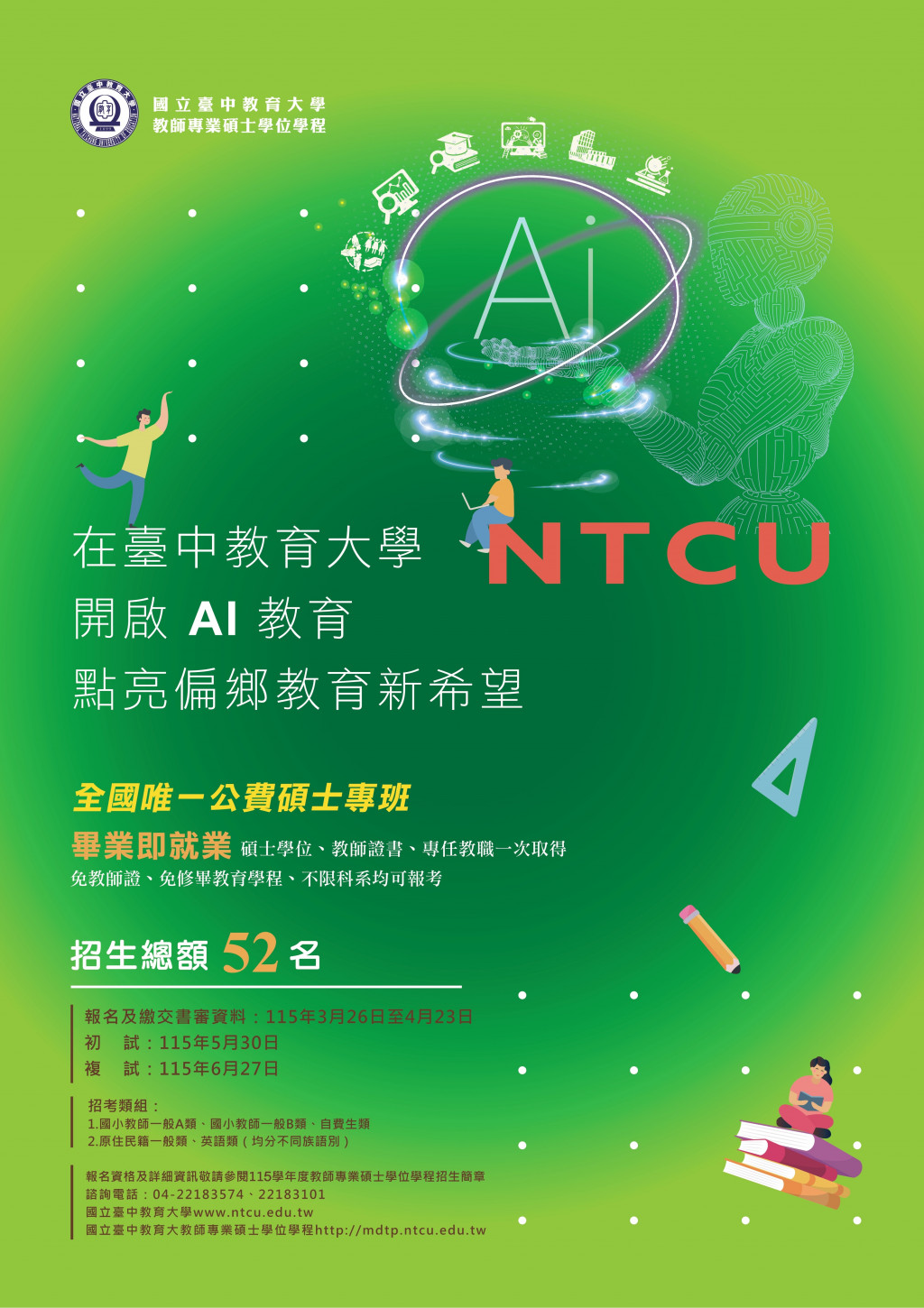 115學年度招生考試自115年3月26日至4月23日報名(含繳交書審資料),5月30日初試,6月27日複試,招生簡章請參閱本校招生資訊網(https://as.ntcu.edu.tw/)。