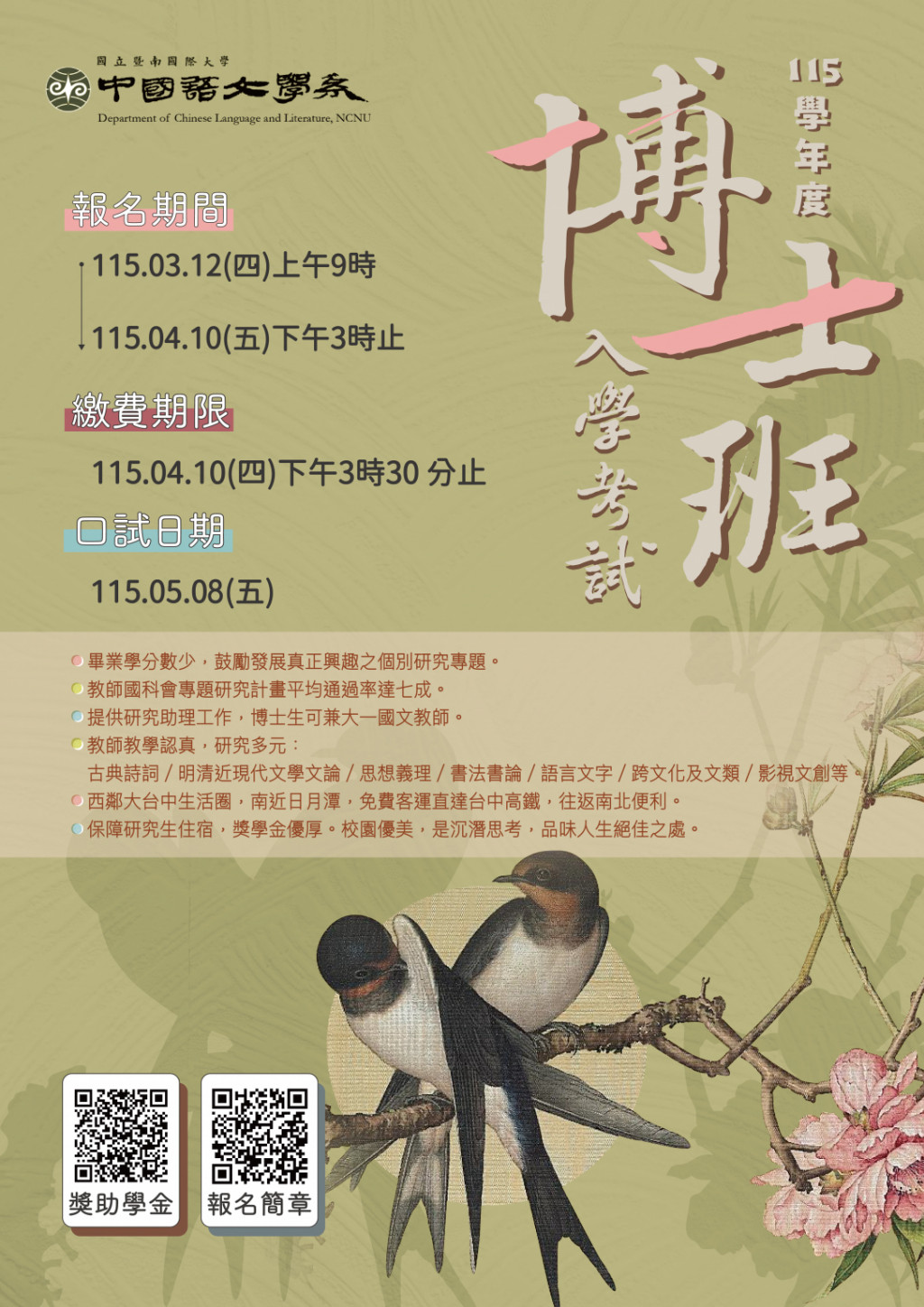 【國立暨南國際大學】本校中國語文學系115學年度博士班入學考試開始報名,檢送招生海報電子檔,請惠予協助公告,請查照。